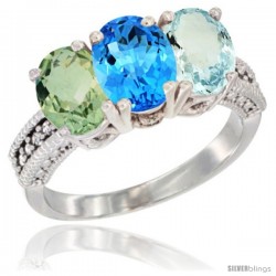 14K White Gold Natural Green Amethyst, Swiss Blue Topaz & Aquamarine Ring 3-Stone 7x5 mm Oval Diamond Accent