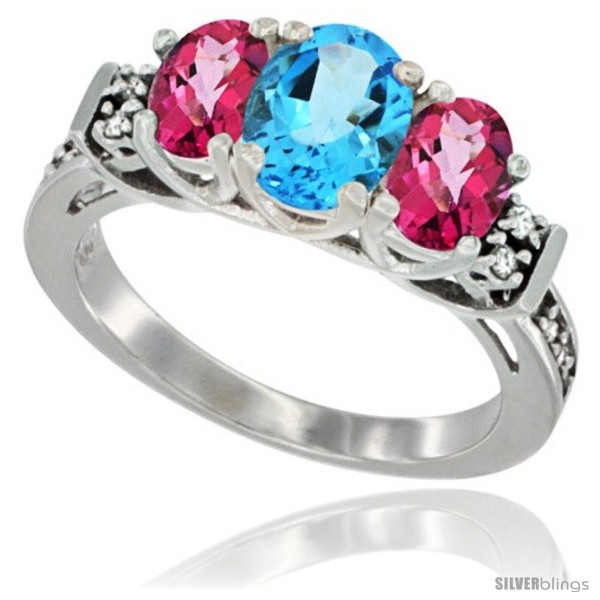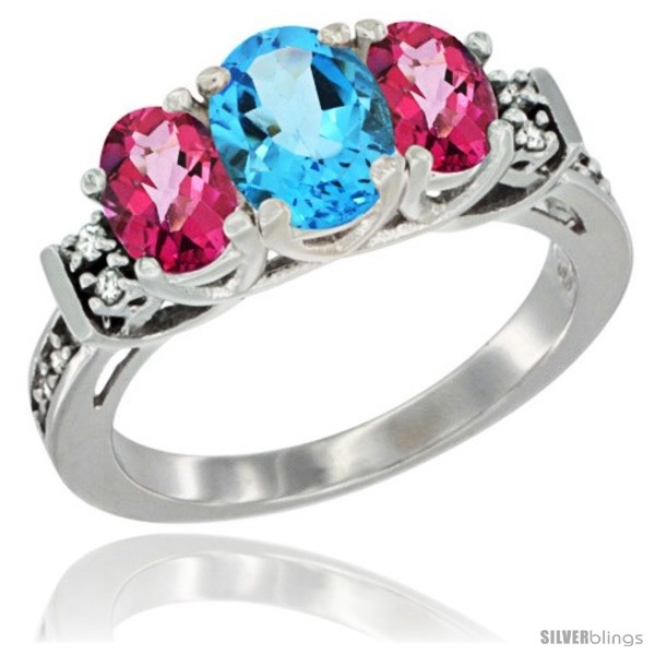 14K White Gold Natural Swiss Blue Topaz & Pink Topaz Ring 3-Stone Oval with Diamond Accent