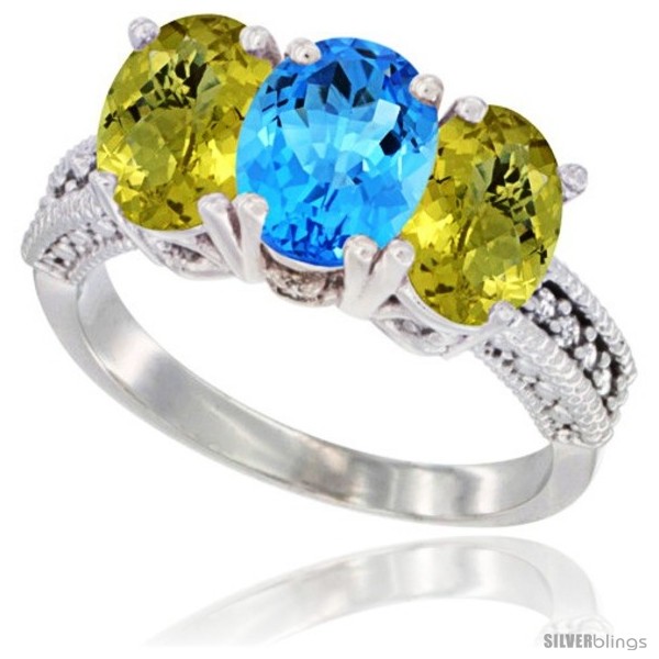14K White Gold Natural Swiss Blue Topaz Ring with Lemon Quartz 3-Stone 7x5 mm Oval Diamond Accent