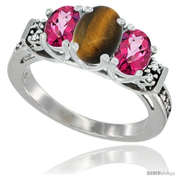 14K White Gold Natural Tiger Eye & Pink Topaz Ring 3-Stone Oval with Diamond Accent