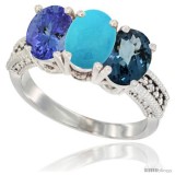 14K White Gold Natural London Blue Topaz, Turquoise & Tanzanite Ring 3-Stone 7x5 mm Oval Diamond Accent