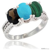 14K White Gold Natural Smoky Topaz, Turquoise & Malachite Ring 3-Stone 7x5 mm Oval Diamond Accent