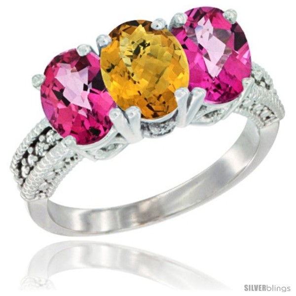 14K White Gold Natural Whisky Quartz & Pink Topaz Ring 3-Stone 7x5 mm Oval Diamond Accent