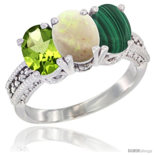 14K White Gold Natural Peridot, Opal & Malachite Ring 3-Stone Oval 7x5 mm Diamond Accent