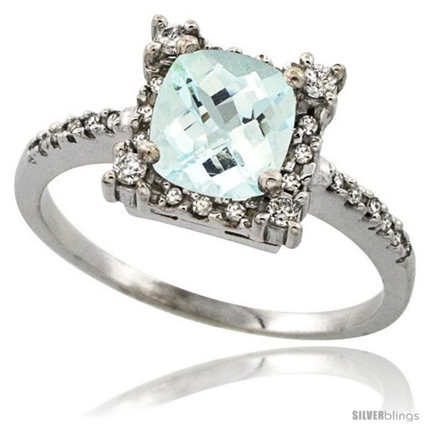 14k White Gold Diamond Halo Aquamarine Ring 1.2 ct Checkerboard Cut Cushion 6 mm, 11/32 in wide