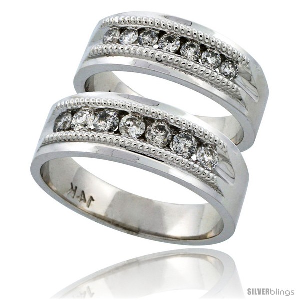 14k White Gold 2-Piece His (7mm) & Hers (6.5mm) Milgrain Design Diamond Wedding Ring Band Set w/ 0.86 Carat Brilliant Cut