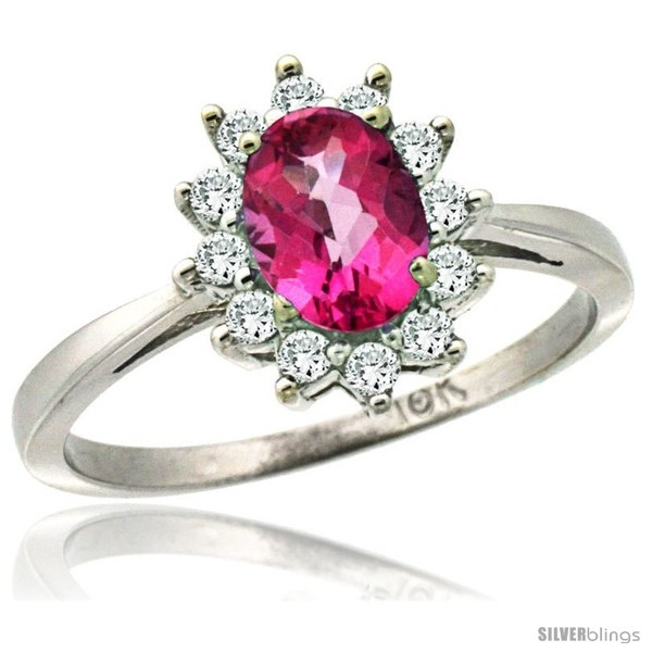 14k White Gold Diamond Halo Pink Topaz Ring 0.85 ct Oval Stone 7x5 mm, 1/2 in wide