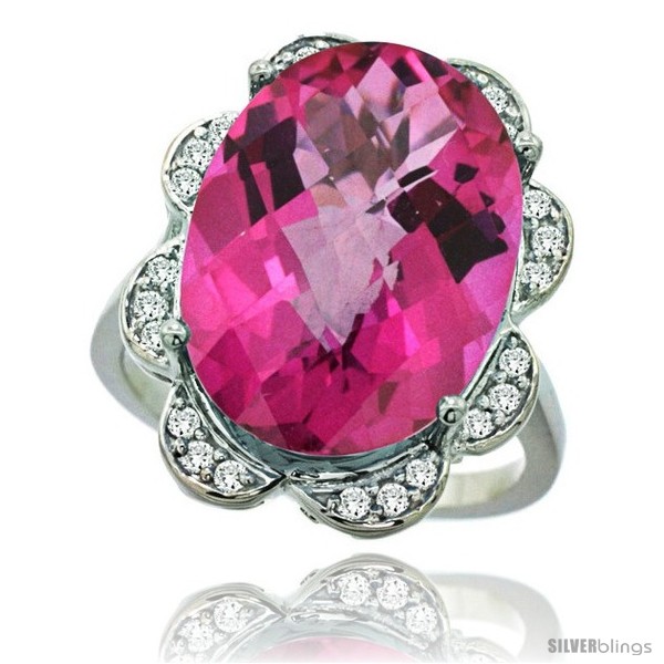 14k White Gold Natural Pink Topaz Ring 18x13 mm Oval Shape Diamond Halo, 3/4inch wide