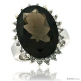 14k White Gold Diamond Halo Smoky Topaz Ring 10 ct Large Oval Stone 18x13 mm, 7/8 in wide