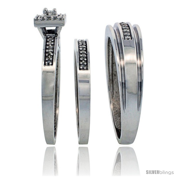 14k White Gold 3-Piece Trio His (6mm) & Hers (2.5mm) Diamond Wedding Band Set, w/ 0.33 Carat Brilliant Cut Diamonds