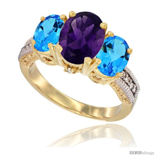 14K Yellow Gold Ladies 3-Stone Oval Natural Amethyst Ring with Swiss Blue Topaz Sides Diamond Accent