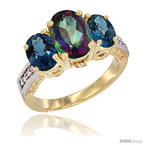 14K Yellow Gold Ladies 3-Stone Oval Natural Mystic Topaz Ring with London Blue Topaz Sides Diamond Accent