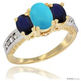 14k Yellow Gold Ladies Oval Natural Turquoise 3-Stone Ring with Blue Sapphire Sides Diamond Accent