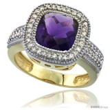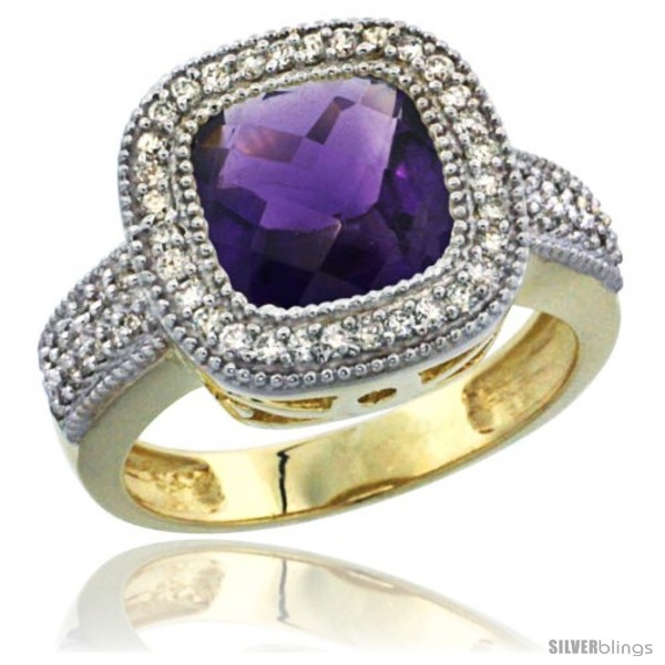 14K Yellow Gold Natural Amethyst Ring Cushion-cut 9x9 Stone Diamond Accent