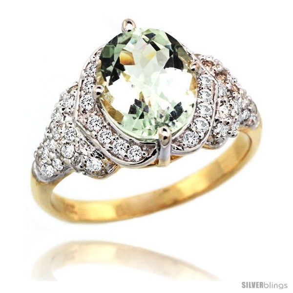 14k Gold Natural Green Amethyst Ring 10x8 mm Oval Shape Diamond Halo, 1/2 in wide