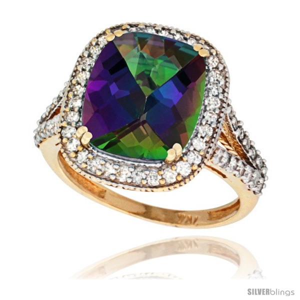 14k Yellow Gold Diamond Halo Mystic Topaz Ring Checkerboard Cushion 12x10 4.8 ct 3/4 in wide