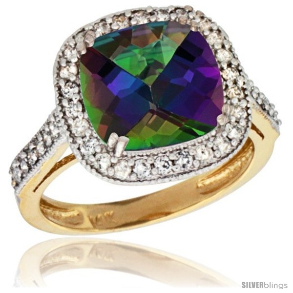 14k Yellow Gold Diamond Halo Mystic Topaz Ring Checkerboard Cushion 9 mm 2.4 ct 1/2 in wide