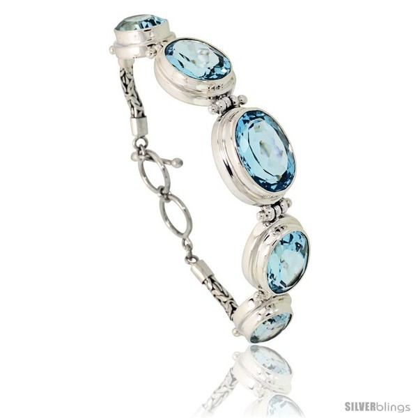 Sterling Silver Bali Style Byzantine Toggle Bracelet, w/ one 19x14mm, two 17x13mm & two 15x11mm Oval Cut Natural Blue Topaz
