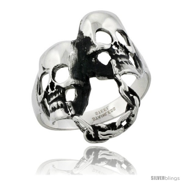 Surgical Steel Biker Ring Chained Double Skull 1 3/16 in