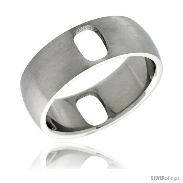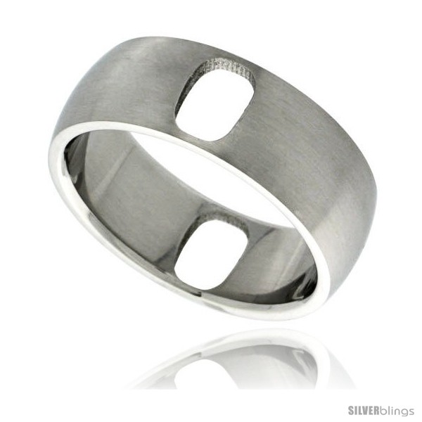 This handsome Wedding Band made from Stainless Steel is a unique and popular item. This Quality Stainless Steel Band is made of Low Nickel 316L Hypo Allergenic Surgical Steel and is no different than the ones you pay for $60.00 to $200.00 each. It is about 5/16" (8mm) Wide, Satin Finish and has 2 Oval Holes Cut out for design. Available in sizes 8 to 14.