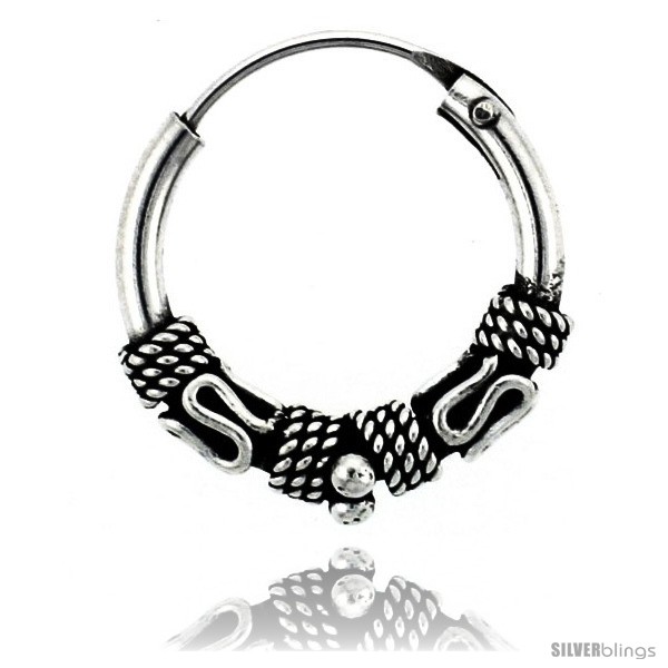 This gorgeous and classy Bali Style Earrings crafted of Sterling Silver is stylish and graceful. This Small Bali Hoop Earrings is made in Solid Sterling Silver. It is Very Well Made with combination of Polished and Antiqued finish. It is a medium-thick (about 2mm or 1/16") continuous style hoops that measures 5/8" (17mm) in diameter.
