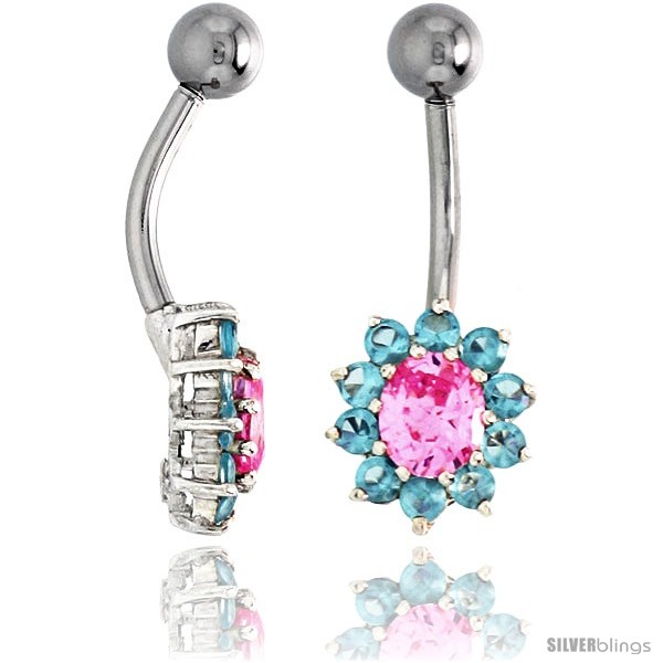 Sunflower Belly Button Ring with Pink and Blue Topaz Cubic Zirconia on Sterling Silver Settings