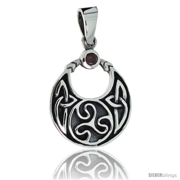 Sterling Silver Round Celtic Pendant w/ Single Red CZ, w/ 18" Thin Box Chain