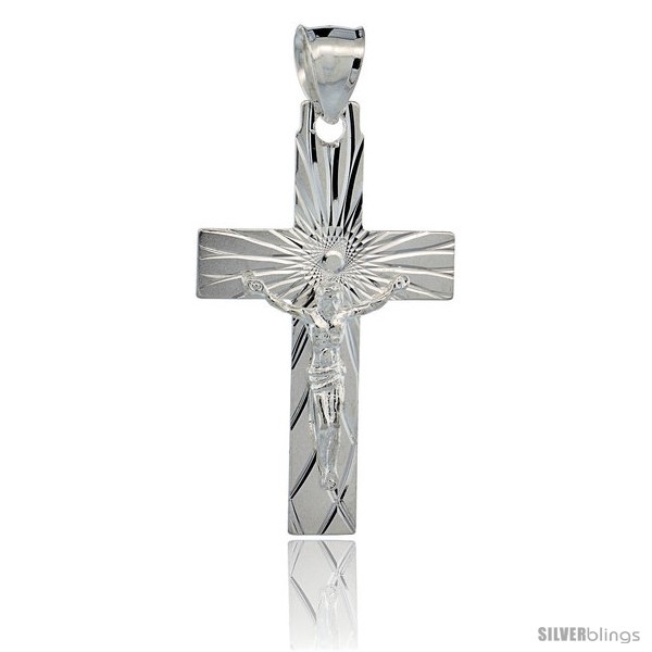 Fashion and style come together in this Crucifix Pendant crafted of Sterling Silver which is unique and well crafterd. This Pendant is crafted from Solid Sterling Silver. The Diamond Cut Finish gives a shimmering look to it. This Religious piece of jewelry would definitely make a Wonderful gift for Christians on . NO Chain Included