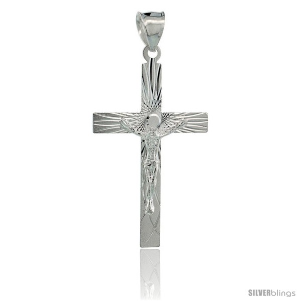 This stylized Crucifix Pendant made from Sterling Silver adds just the right amount of flair to any attire. This Pendant is crafted from Solid Sterling Silver. The Diamond Cut Finish gives a shimmering look to it. This Religious piece of jewelry would definitely make a Wonderful gift for Christians on . NO Chain Included