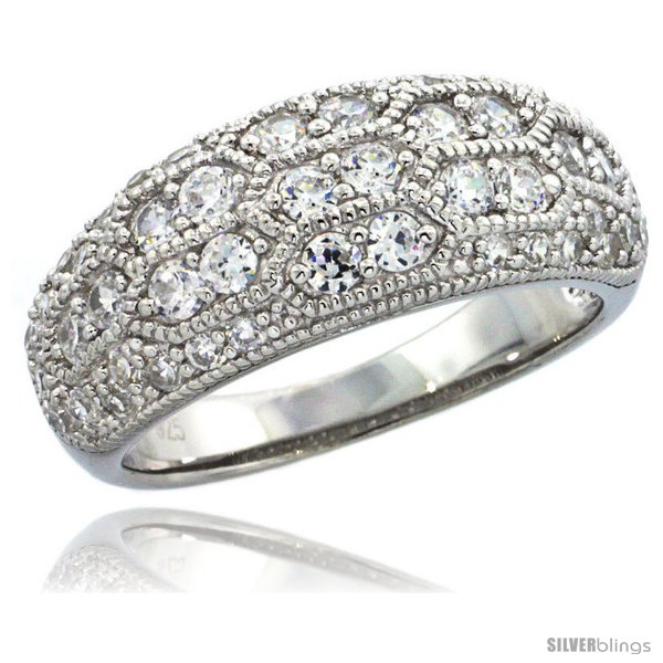 Sterling Silver Hexagon Pattern Dome Ring w/ Brilliant Cut CZ Stones, 5/16 in. (8 mm) wide