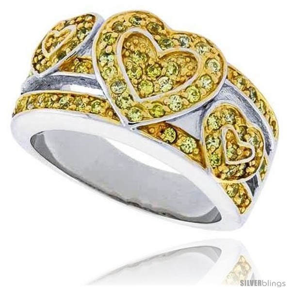 Sterling Silver & Rhodium Plated Hearts Band, w/ Tiny High Quality Citrine CZ's, 1/2" (13 mm) wide