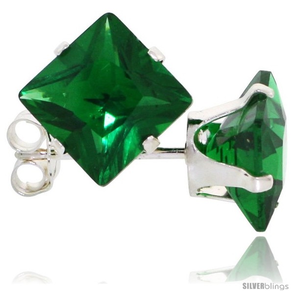 Sterling Silver Princess cut Cubic Zirconia Stud Earrings 7 mm Emerald Green Color 4 cttw