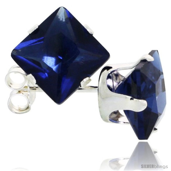 Sterling Silver Princess cut Cubic Zirconia Stud Earrings 7 mm Sapphire Blue Color 4 cttw