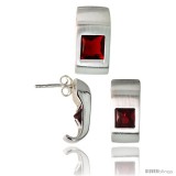 Sterling Silver Matte-finish Fancy Earrings (16mm tall) & Pendant Slide (17mm tall) Set, w/ Princess Cut Ruby-colored CZ Stones