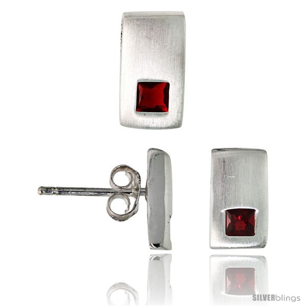 Sterling Silver Matte-finish Rectangular Earrings (10mm tall) & Pendant Slide (10mm tall) Set, w/ Princess Cut Ruby-colored CZ
