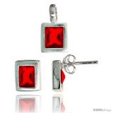 Sterling Silver Matte-finish Rectangular Earrings (8mm tall) & Pendant (13mm tall) Set, w/ Emerald Cut Ruby-colored CZ Stones