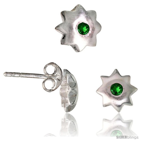 Sterling Silver Matte-finish Star Stud Earrings (7 mm) & Pendant Slide (8 mm) Set, w/ Brilliant Cut Emerald-colored CZ Stones