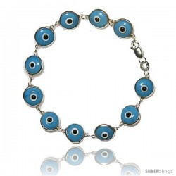 This glamorous Evil Eye Bracelet made with Sterling Silver is much sought after. This bracelet is known to ward off bad luck by the 'Evil Eye.' This bracelet is crafted from fine sterling silver and features Yellow-colored beads decorated with eye designs. Each EYE is separated with sterling silver ring spacers and secured with a lobster-claw clasp. This piece of jewelry is Good-looking and yet the price is Very Reasonable.