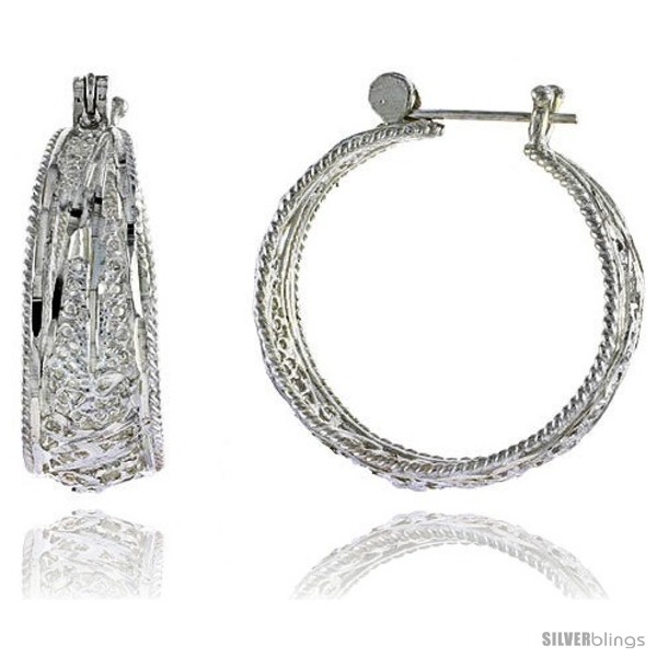 Sterling Silver 1 5/16" (33 mm) tall Filigree Hoop Earrings, w/ Snap-down Lock