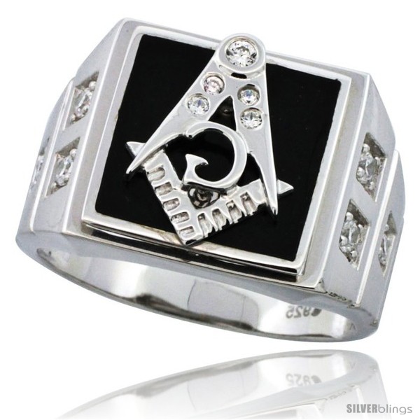 Sterling Silver Men's Black Onyx Masonic Ring CZ Stones & Square Accents, 19/32 in (15 mm) wide