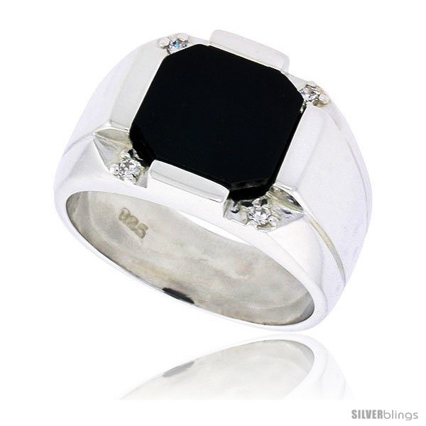 Sterling Silver Gents' Octagon Black Onyx Ring, w/ 2 Light Grooves At-a-Side & 4 CZ Stones, 1/2" (13 mm) wide