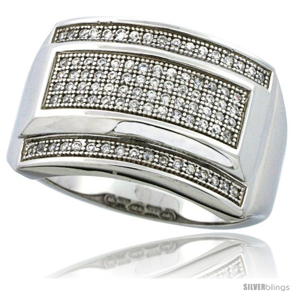 Sterling Silver Men's Large Rectangular Ring 90 Micro Pave CZ Stones, 19/32 in (15 mm) wide