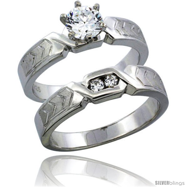 Sterling Silver Cubic Zirconia Ladies' Engagement Ring Set 2-Piece Chevron Pattern Channel Set, 3/16 in wide