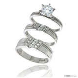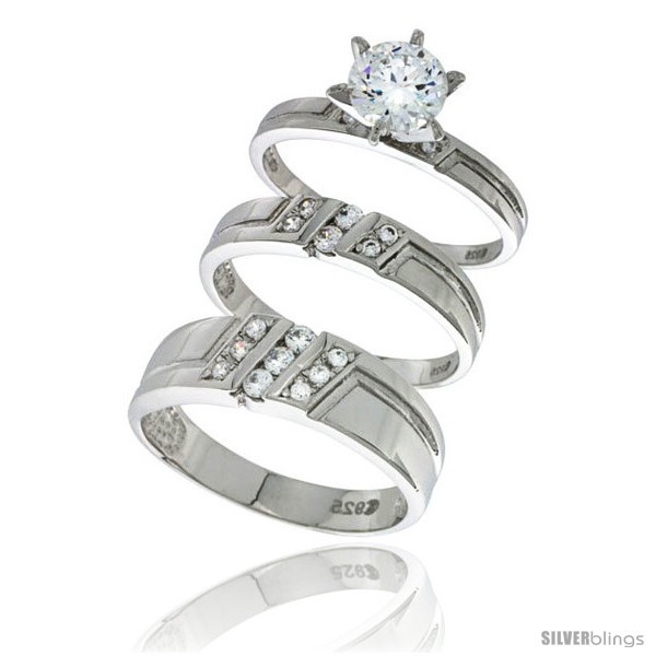 Sterling Silver Cubic Zirconia Trio Engagement Wedding Ring Set for Him & Her, men's band 1/4 in wide, L 5 - 10 & M 8 - 14