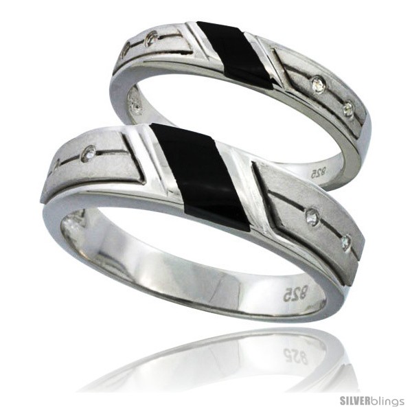 Sterling Silver Cubic Zirconia Wedding Band Ring 2-Piece Set 5.5 mm Him & Hers 3.5 mm Black Onyx