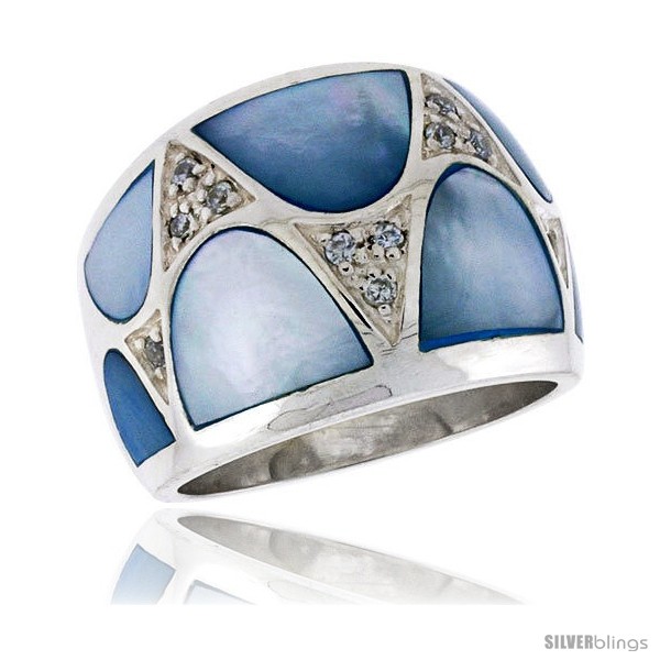 Highest Quality Sterling Silver 5/8 in (16 mm) wide Ladies' Dome Band, Blue Mother of Pearl & Brilliant Cut CZ Stones