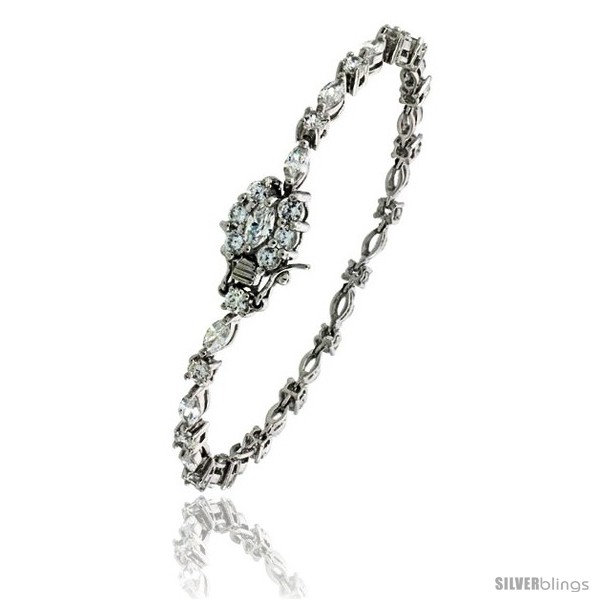 Sterling Silver Tennis Bracelet Cubic Zirconia Stones Alternating Round & Marquise Cut, Rhodium Finish, with Hidden safety